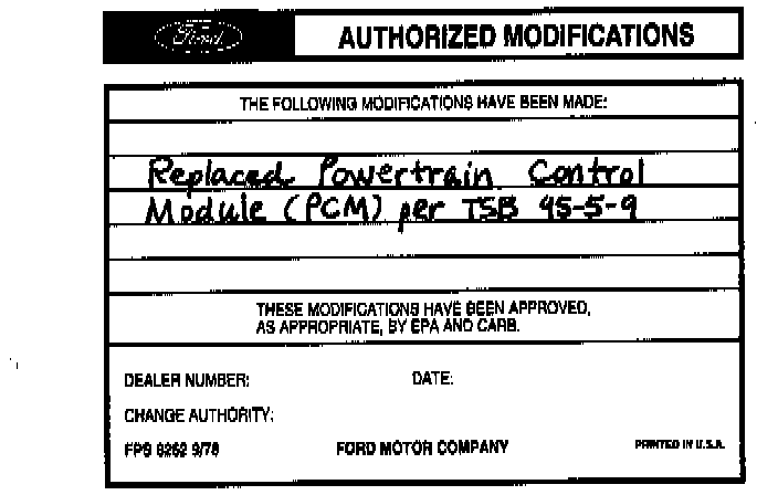 Obtain an Authorized Modifications Decal and list the date, dealer number, and summary of alterations performed. Select a prominent place adjacent to the Vehicle Emission Control Information Decal suitable for installing the Authorized Modifications Decal. Clean the area, install the decal, and cover it with a clear plastic decal shield.
