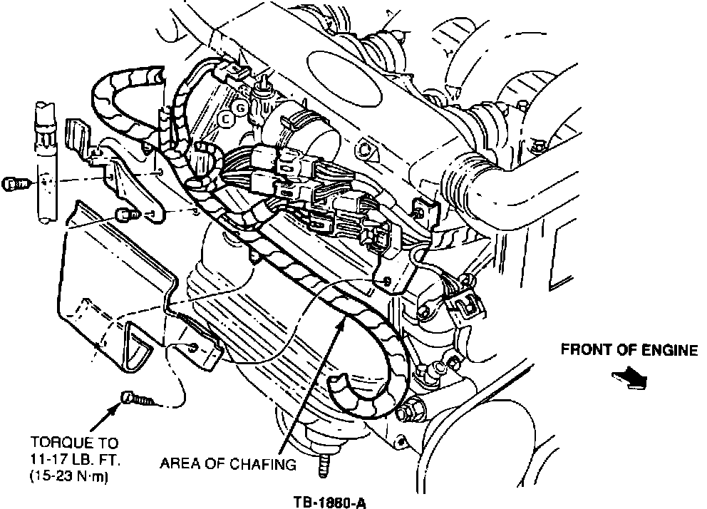 1. Pull the 12A581 engine wiring harness up from the studbolt area and check for worn wires.