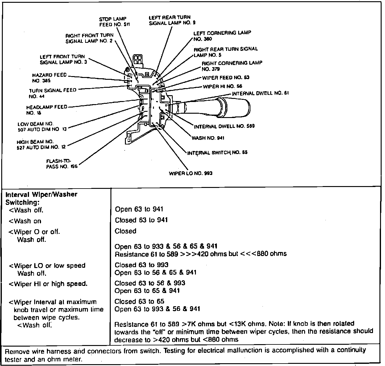 When testing a non-intermittent wiper switch, a self-powered test lamp or an ohmmeter can be used to check continuity. When testing an intermittent wiper switch, use only an ohmmeter to check continuity.