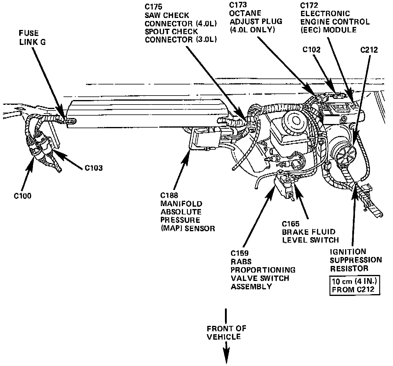 The SPOUT connector (SAW check connector C175) shorting bar, is located at the LH rear of the engine compartment on the passenger side of master cylinder.