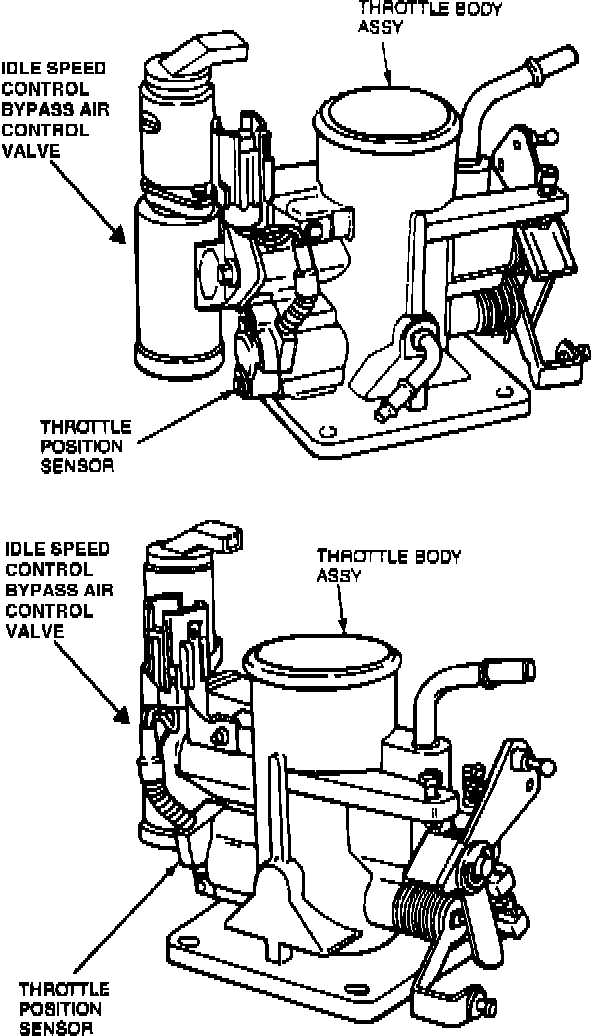 As the throttle plates move, the pivot arm moves along the curved resistor and receives a varying voltage signal. The ECA reads this signal and converts it into throttle plate angle. The voltage signal ranges from approximately one (1) volt at idle to approximately five (5) volts at wide open throttle.