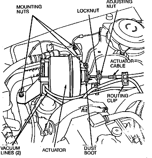 1. Disconnect battery ground cable, then remove wiring routing clip from actuator cable.
