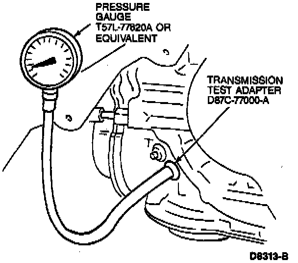 2. Remove the square head plug (marked "L") and install Transmission Test Adapter D87C-77000-A and Pressure Gauge T57L-77820-A or equivalent.