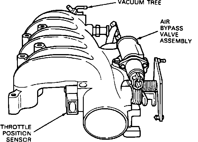 The Throttle Position (TP) sensor, mounted on the throttle body, is a potentiometer that monitors throttle plate angle and sends a signal to the Engine Control Assembly (ECA). The TP sensor contains a pivot arm that moves along a curved resistor. One of the sensor leads supplies a five (5) volt reference signal (sent by the ECA) to the resistor. The second lead is used to ground the resistor. The third lead is for the voltage signal to the ECA.