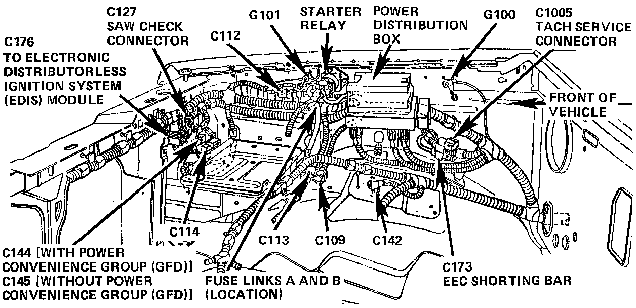 The SPOUT connector (SAW check connector C127) is located at the RH front of the engine compartment in front of the battery.