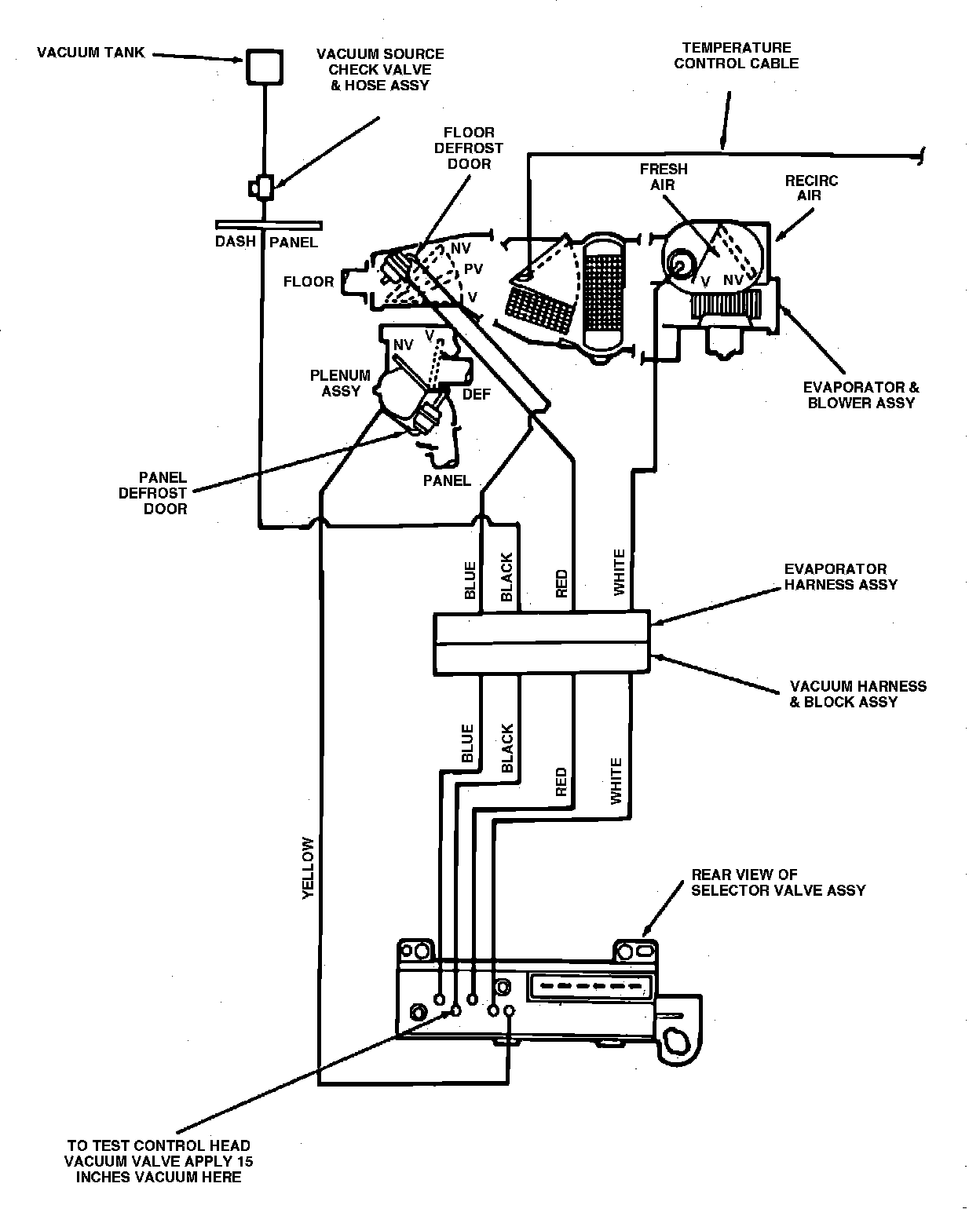 To test the A/C heater control system, start engine and move function selector lever slowly from one position to another. A momentary hiss should be heard as selector lever is moved from one position to another indicating that vacuum is available at the control assembly. A continuous hiss at the control assembly indicates a major leak somewhere in the system. It does not necessarily indicate that the leak is at the control assembly.