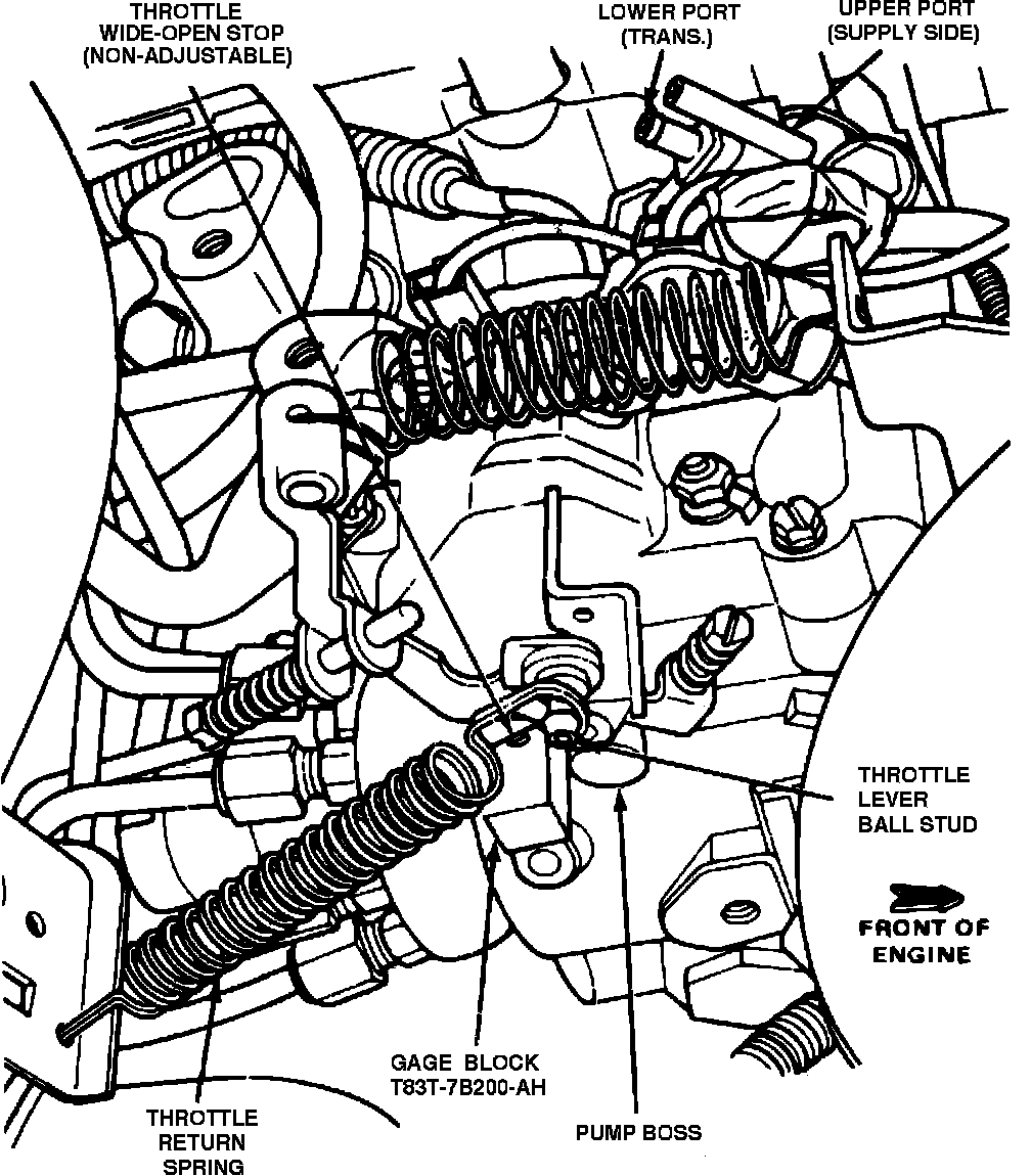 3. Remove throttle return spring. Install one end of spring over throttle lever ball stud and other end of spring over throttle cable support bracket. Insert gage block T83T-7B200-AH (.515 inch) or equivalent, Fig. 5, between pump boss and throttle wide open stop.