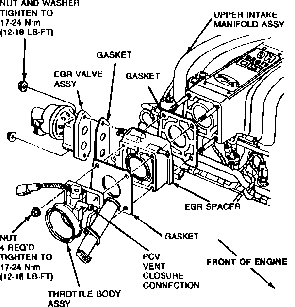 4. Install the EGR valve to the EGR spacer, with a new gasket. Torque the EGR valve mounting bolts to 12-18 ft lb (16-24 Nm).