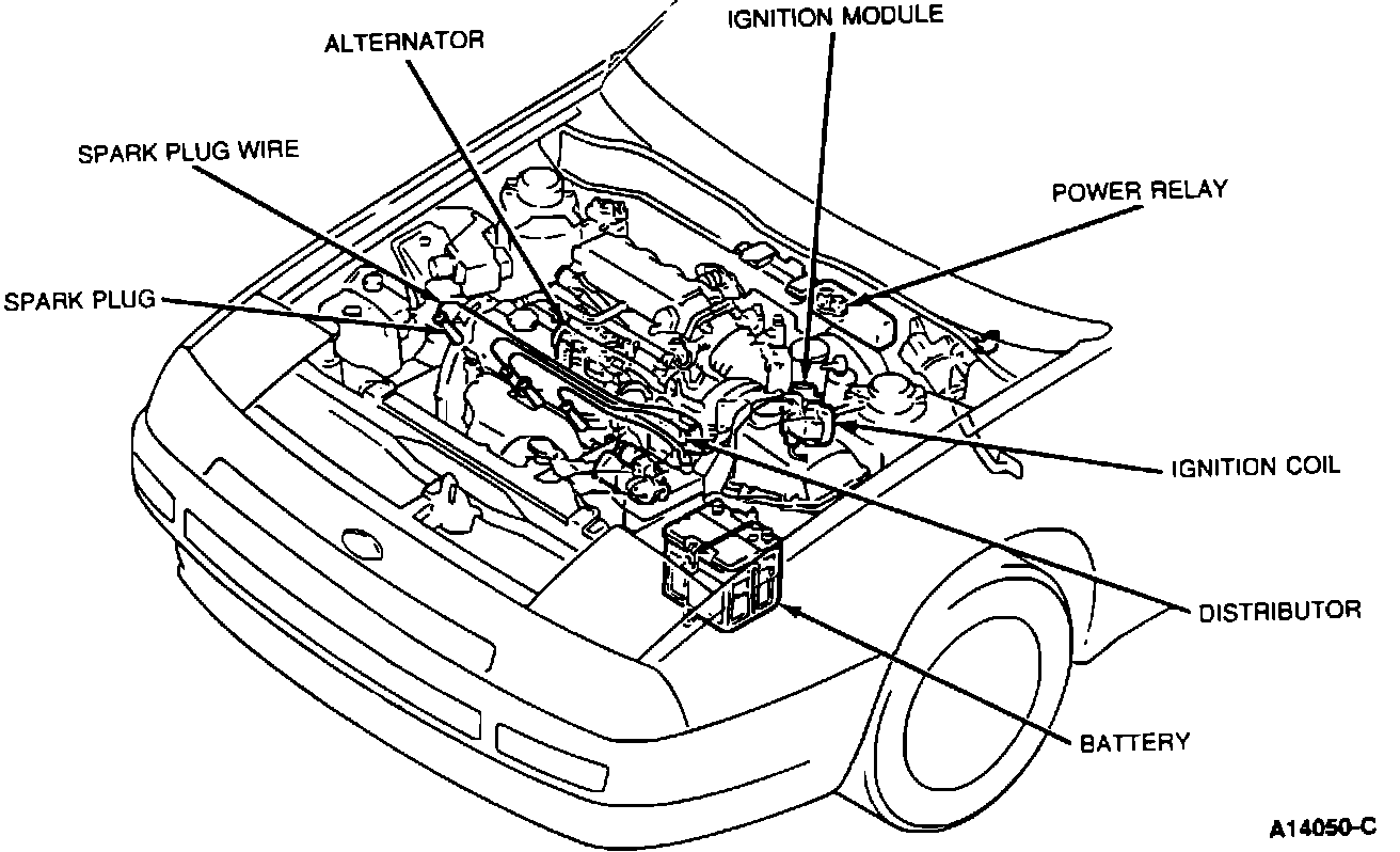 The ignition system is entirely electronic and ECA controlled. The ECA receives a triggering signal from various switches and sensors and sends the spark timing signal through the ignition module to the distributor. The distributor provides a signal to the ECA indicating crankshaft top dead center by means of its cylinder TDC sensors.