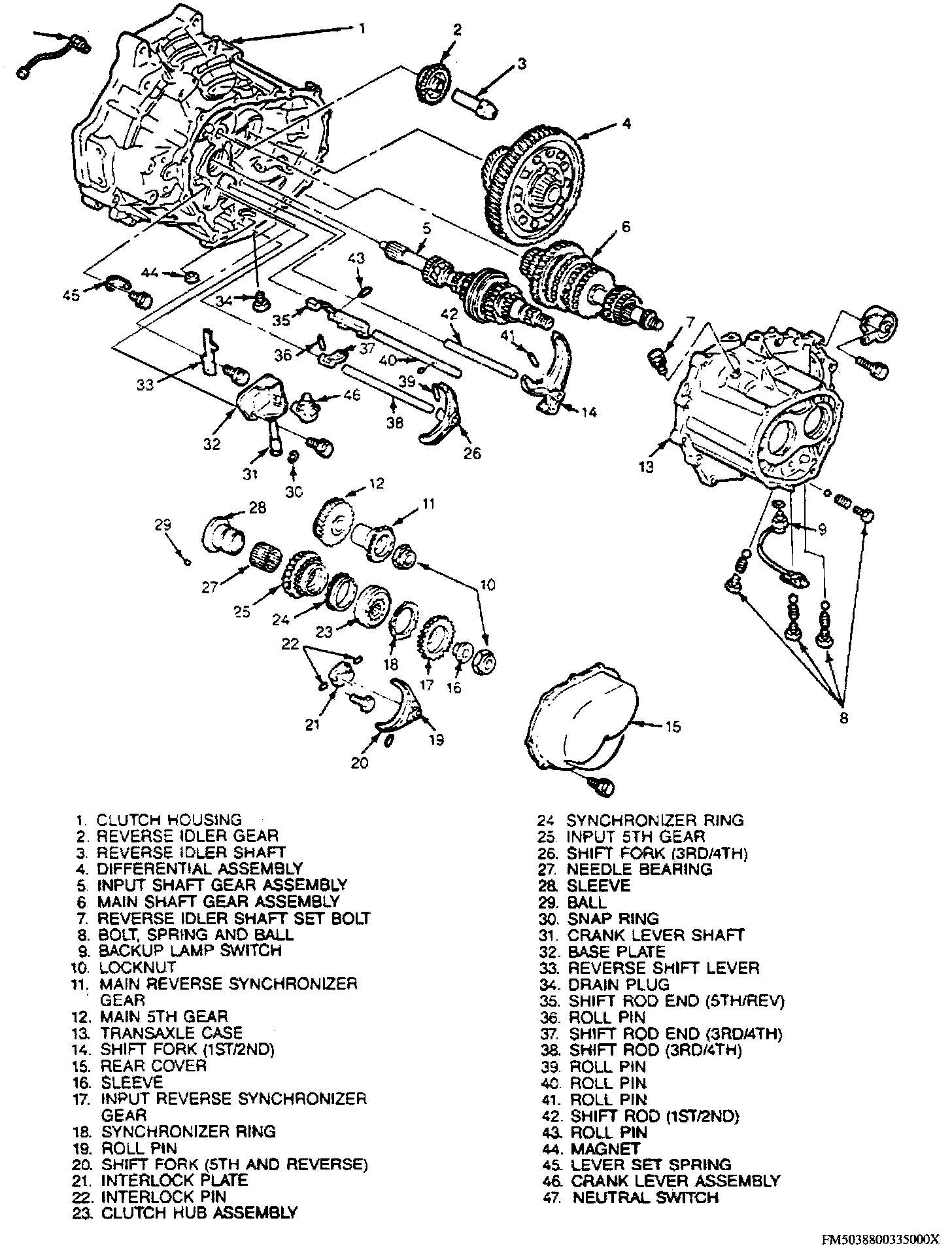 10. Remove transaxle case bolts and reverse idler shaft set bolt, then the transaxle case. If necessary, tap case lightly with soft faced hammer to break gasket seal.