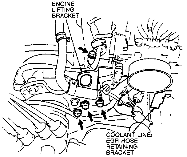 9. Install engine lifting bracket mounting bolt and coolant line/EGR hose retaining bracket to throttle body.