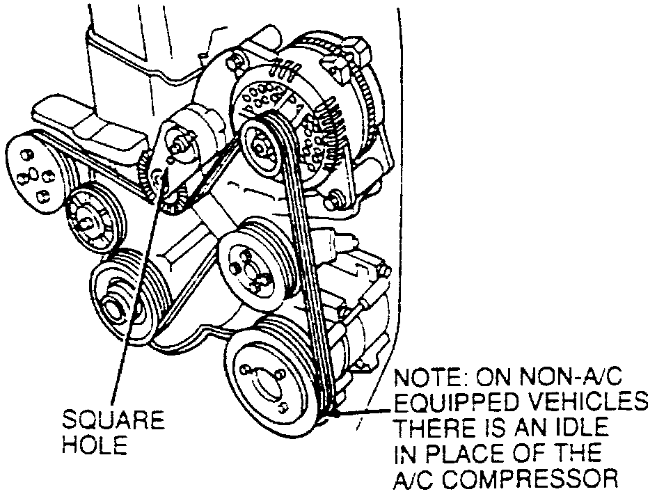 1. Insert a 1/2-inch ratchet in square hole in tensioner (tensioner has a 1/2-inch square hole cast into the tensioner arm directly behind the pulley), ROTATE tensioner CLOCKWISE and remove belt from pulleys.