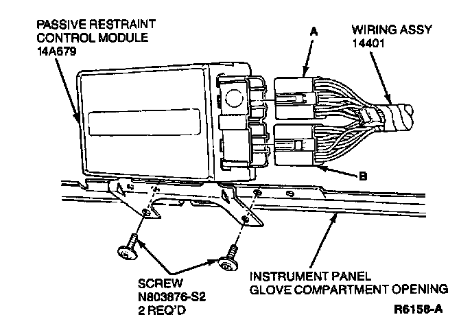 Connectors A and B are part of the 14401 wiring assembly. The control module is located beneath the instrument panel to the right of the steering column.