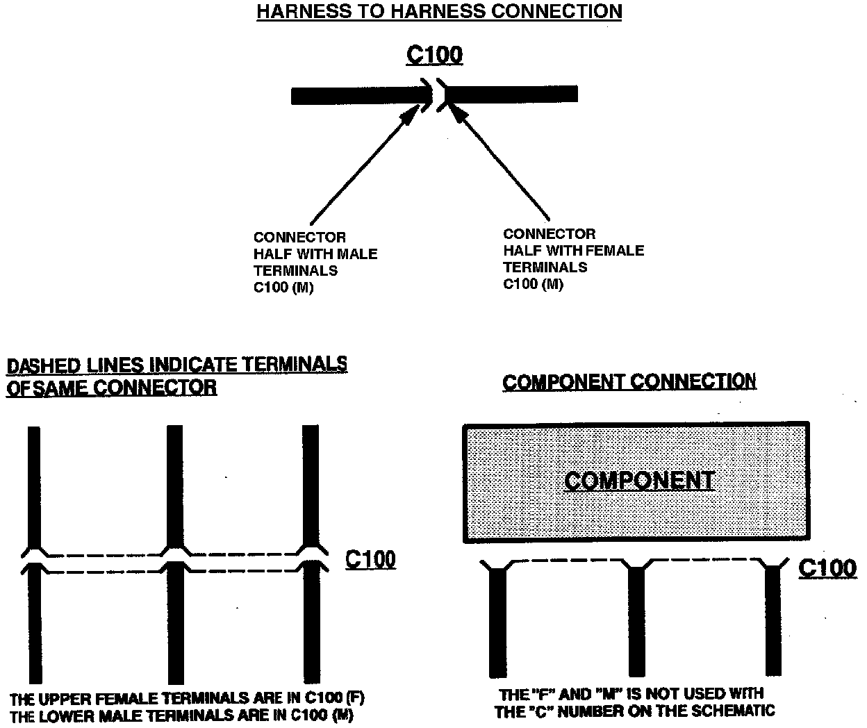 Find the connector "C" number in the diagrams, then locate the "C" number in the Connector to Harness Cross Reference List and read the basic harness part number which becomes useful if ordering parts.