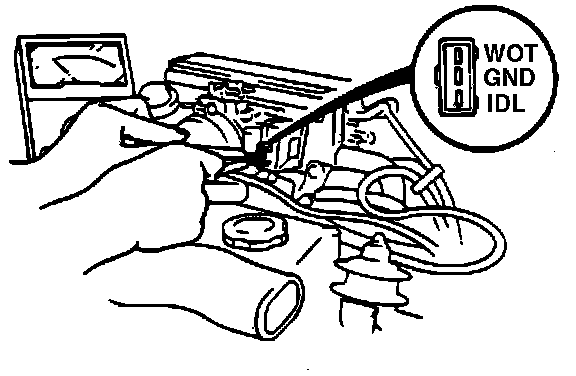 3. Insert appropriate thickness gauge between throttle and adjustment screw. Check for continuity between terminals. Use the following chart to determine the need for adjustment.