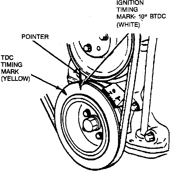 7. Check base timing. White timing mark on crankshaft pulley should align with white pointer on timing belt cover.