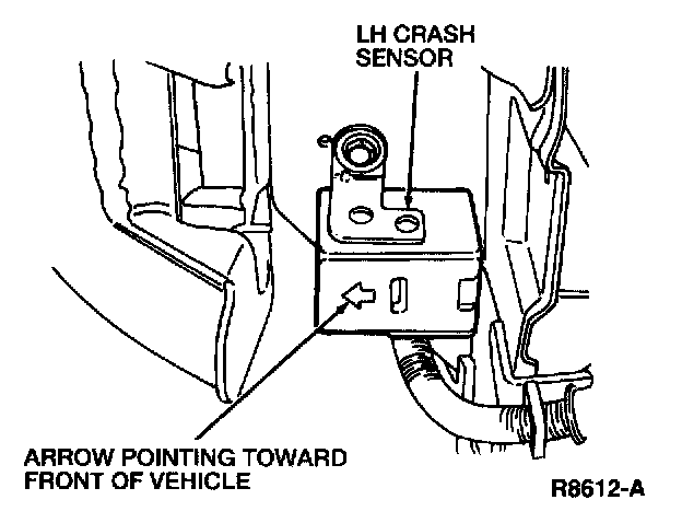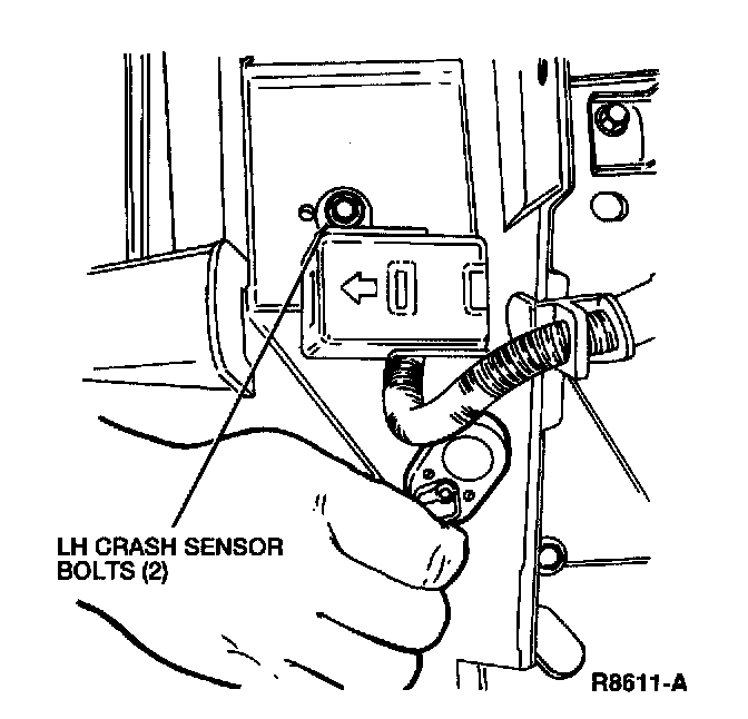 1. Position the LH crash sensor with the arrow pointing toward the front of the vehicle and install the two LH crash sensor bolts. Tighten the LH crash sensor bolts to 9-12 Nm (79-112 lb-in).