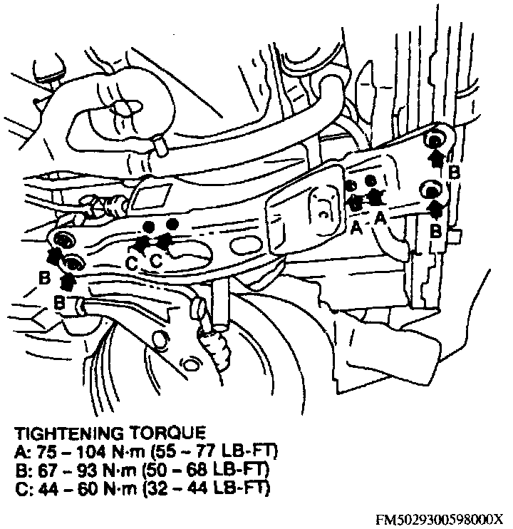 14. Install transaxle cradle. Torque cradle bolts (A) to 55-77 ft lbs, (B) to 50-68 ft lbs, and (C) to 32-44 ft lbs.