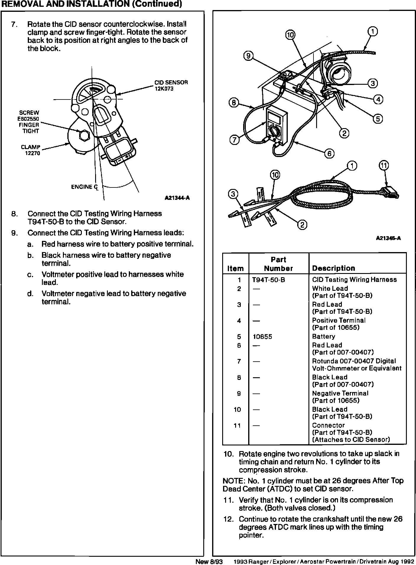 Camshaft removal and installation procedures require revision to accommodate the presence of the CID Sensor, and provide alignment procedures for the sensor. Also, Camshaft installation procedures, applicable to Ranger/Explorer, California only, must be added. Pages 03-01D-21 and 03-01D-22 of the 1993 Aerostar/Ranger/Explorer Service Manual (Powertrain/Drivetrain) are affected; Pages 03-01D-22A through 03-01D-22C are new.