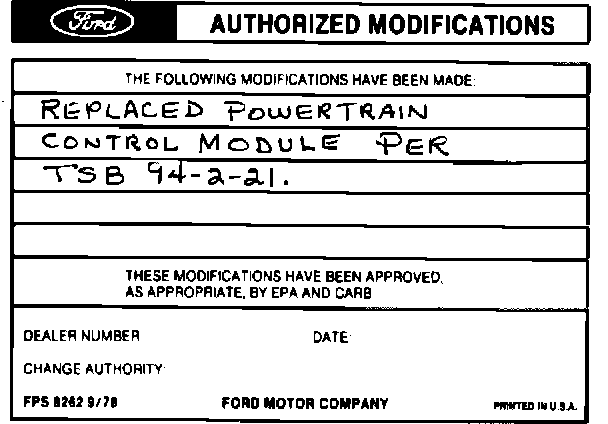 Obtain an Authorized Modifications Decal and list the date, dealer number, and summary of alterations performed. Select a prominent place adjacent to the Vehicle Emission Control Information Decal suitable for installing the Authorized Modifications Decal. Clean the area, install the decal, and cover it with a clear plastic decal shield.