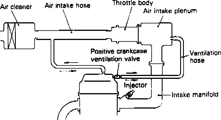 While the engine is running, air is drawn into the crankcase from the air cleaner assembly to be mixed with the blow-by gases. As the PCV valve opens, manifold vacuum and crankcase pressures route the air-diluted blow-by gases into the induction system to be burned.