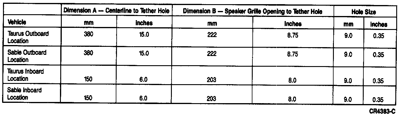 Dimension A is the distance from the centerline of the vehicle to the center of the attachment holes. Dimension B is the approximate distance from the center of the radio speaker grille opening to the center of the tether attachment holes.