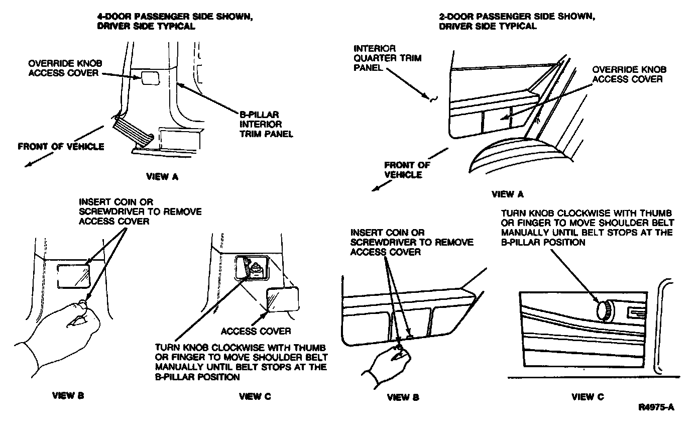 5. If the belt does not move to the B-pillar, the belt may be broken or the motor drive gear stripped. Grasp the belt and pull it toward the B-pillar while turning the knob on the motor clockwise. This should move the belt to the lowest position on the B-pillar. (This will allow the occupant to position the belt manually over the shoulder until the vehicle can be serviced.)