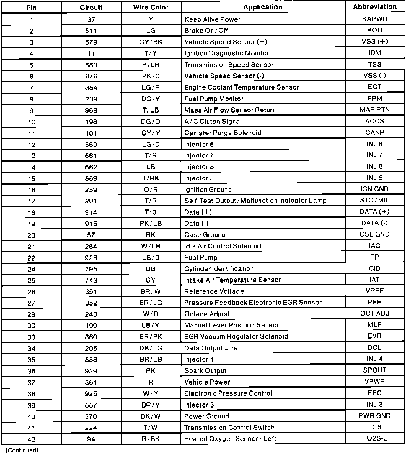 Powertrain Control Module (PCM) Connector Pin Usage: