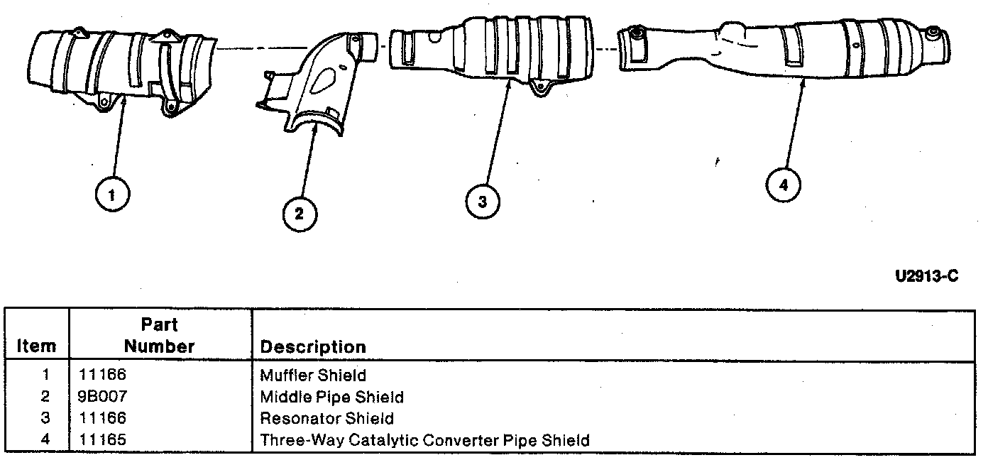 Remove the four mounting bolts and rotate the exhaust shield around the three-way catalytic converter pipe to remove.