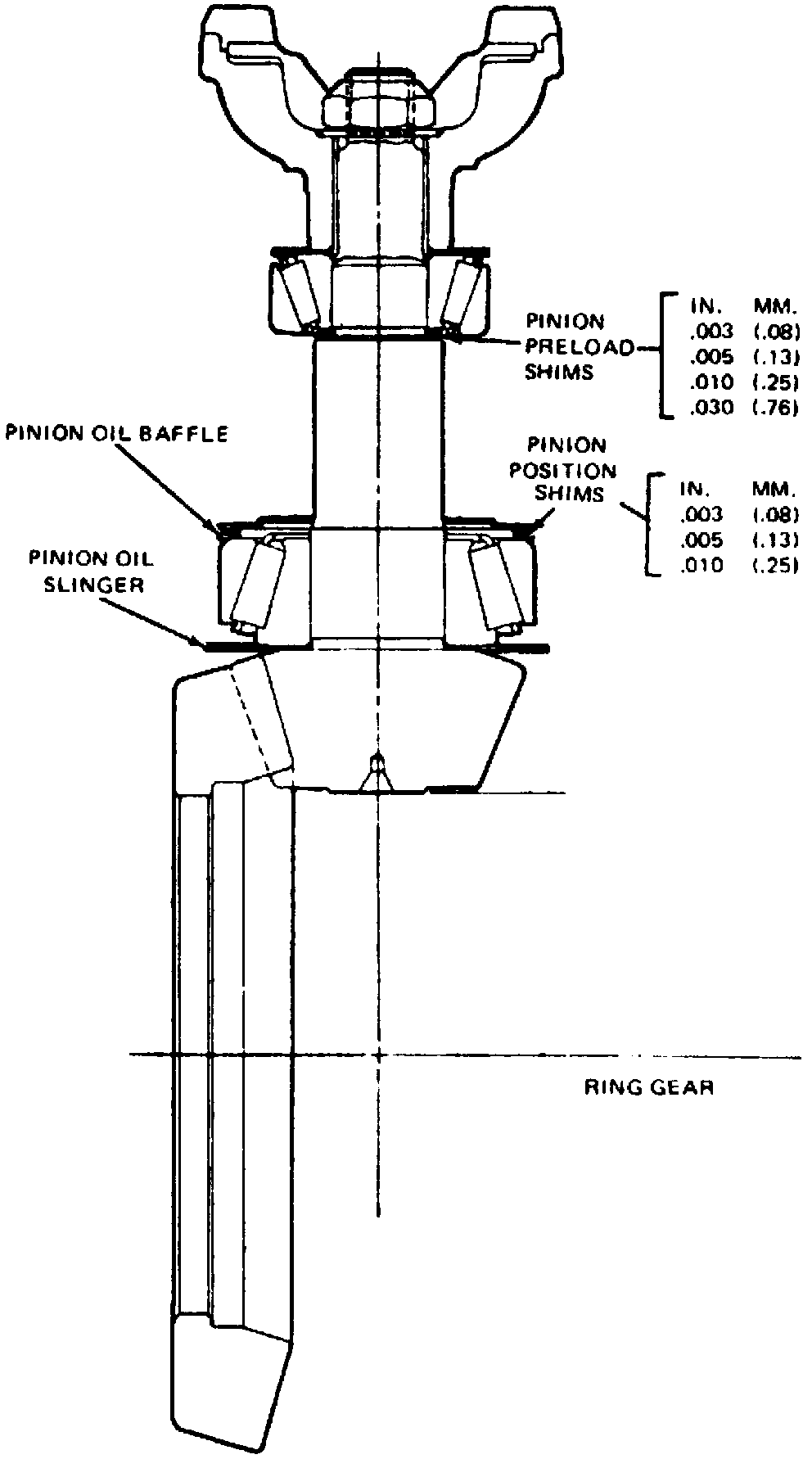 Pinion depth is controlled by a pinion locating shim pack installed between drive pinion inner bearing cup and carrier housing. This shim pack and inner oil slinger and oil baffle controls the position of the pinion. Adding shims moves pinion toward ring gear and removing shims moves pinion away from ring gear.
