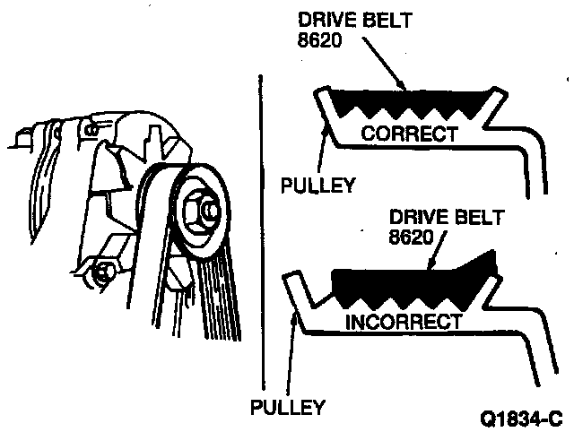 CAUTION: Ensure belt is properly installed before starting engine, otherwise belt damage will occur.^ Conditions requiring drive belt replacement are excessive wear, rib chunk-out, severe glazing, frayed cords. Replace any drive belt exhibiting one of these conditions.