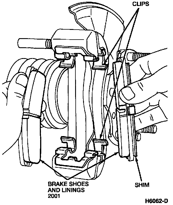 9. Remove the brake shoes and linings from the front disc brake caliper anchor. Remove the two clips.