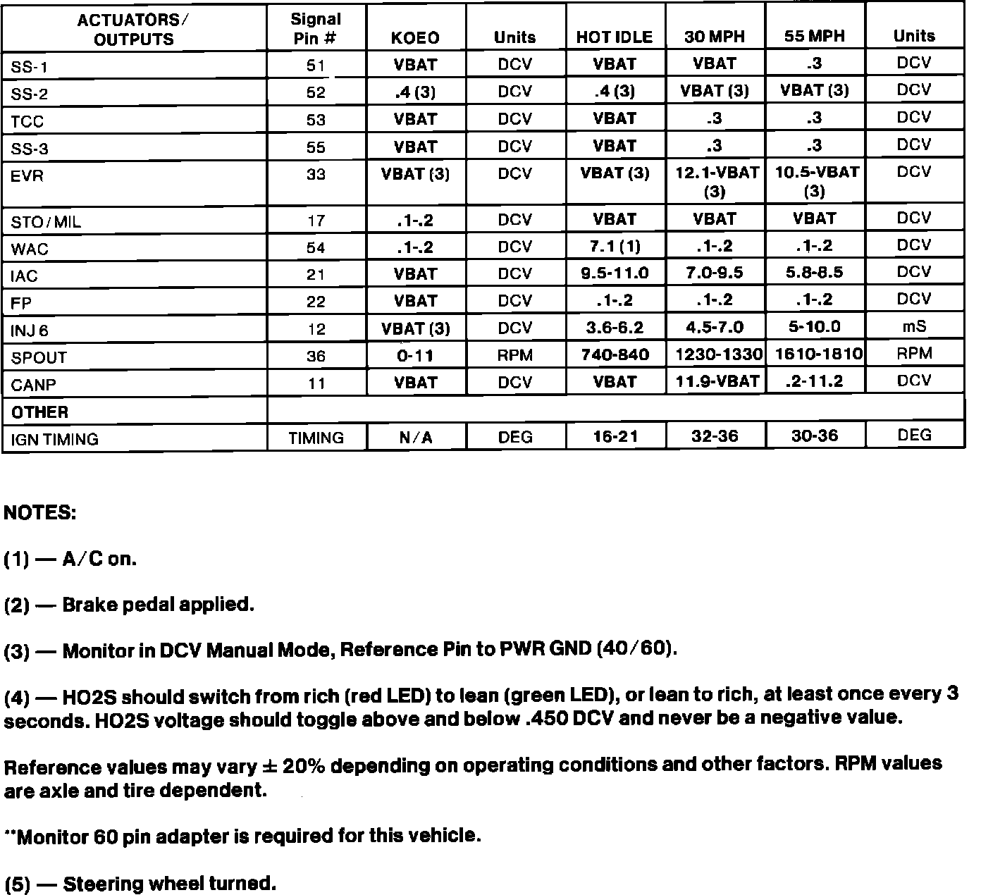 - Key On Engine Off (KOEO) and Hot Idle test values are recorded with vehicle in "NEUTRAL".