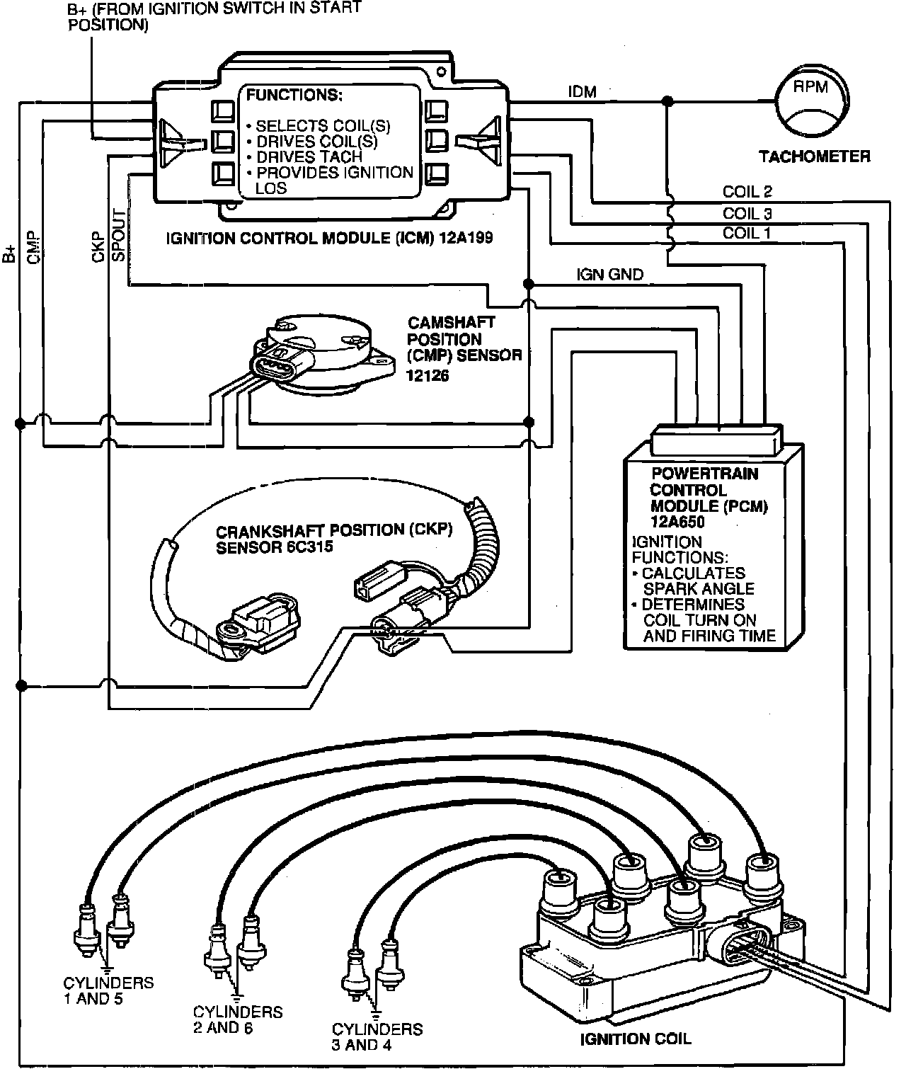 The PCM determines spark angle using the PIP signal to set base timing. Spout is sent from the processor to the ICM and serves two purposes: The leading edge fires the coil and the trailing edge controls the dwell time. This feature is called Computer Controlled Dwell (CCD).
