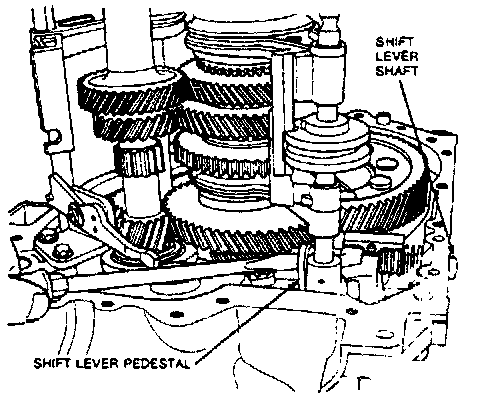 8. Slide shift lever shaft, notch down, through shift lever, then use plastic tipped hammer to tap shift shaft through lever and fifth gear kickout spring into clutch housing bore.