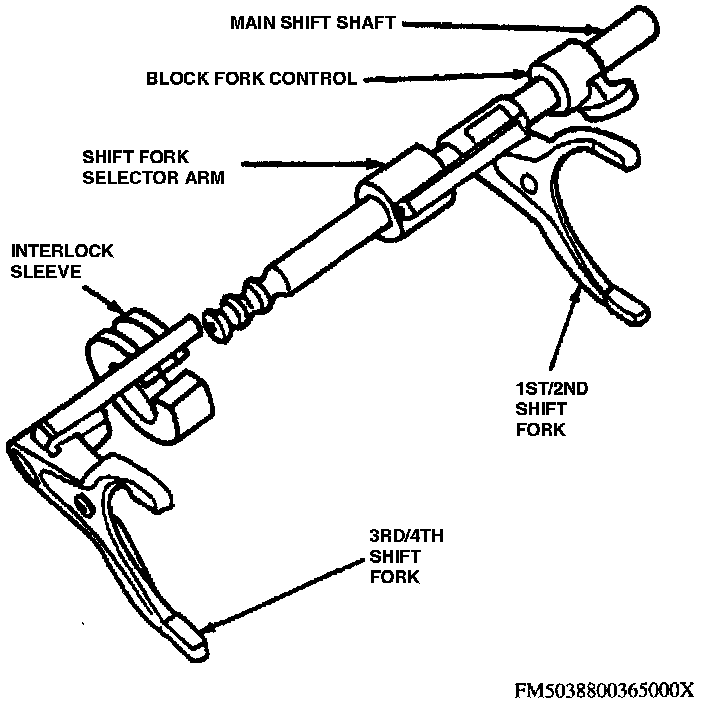 2. Rotate 1-2 shift fork until notch in fork is positioned over selector arm finger, then slide third and fourth fork and interlock sleeve off shaft.