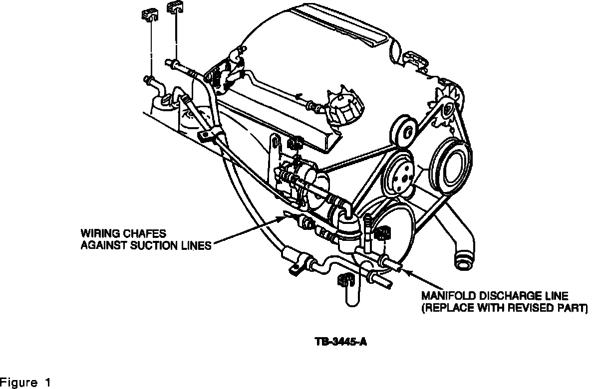 Replace the manifold and hose assembly with a revised assembly which positions the switch wiring away from the steel suction line. Refer to the 1994 Thunderbird/Cougar Service Manual, Section 12-03A-36, for removal and installation procedures