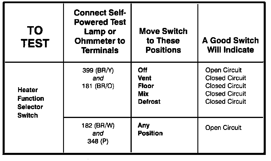 Heater Function Selector Switch - Component Testing Procedure: