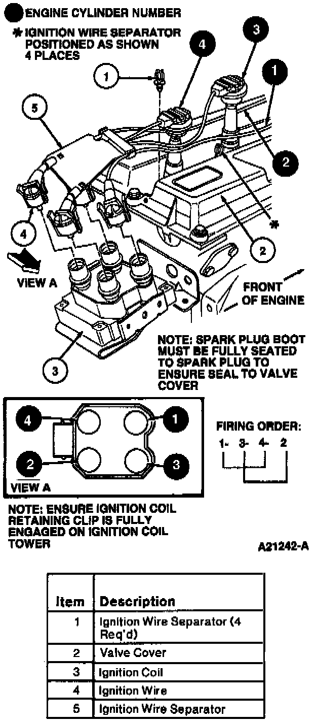 CAUTION: Proper installation of ignition wires is critical to vehicle operation. If one ignition wire is not properly installed on the spark plug or ignition coil, both spark plugs connected to that ignition coil may not fire properly.