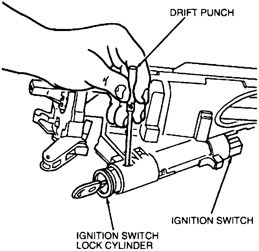 NOTE: The following procedure is for vehicles in which the ignition switch lock cylinder is inoperative and the ignition switch lock cylinder cannot be rotated due to a lost or broken lock cylinder key, unknown key number or with an ignition switch lock cylinder cap damaged and/or broken to extent key cannot be rotated.REMOVAL