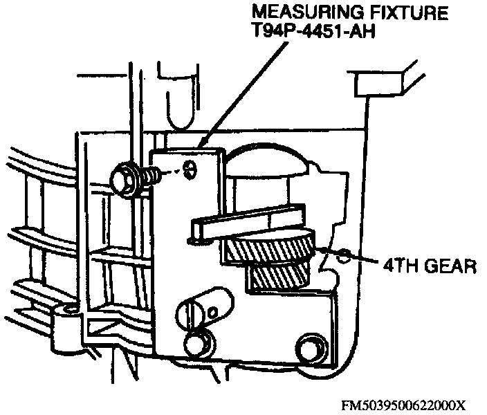 20. Install output shaft endplay measurement tools with dial indicator stem resting on measuring fixture and fixture against transaxle fourth gear as shown.
