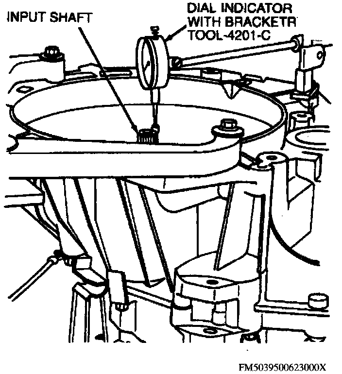 17. Install suitable dial indicator using bracket tools, then position indicator stem on input shaft end and reset indicator to zero.