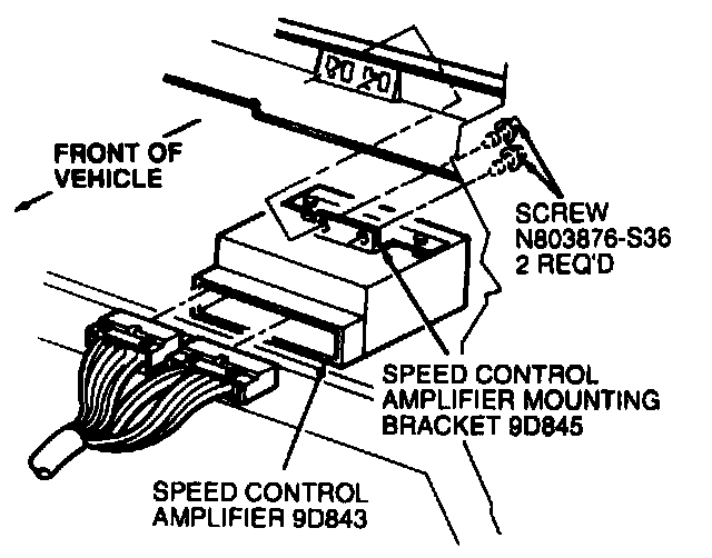 The Speed control amplifier (9D843) assembly is located on the LH side of the instrument panel (04320) behind the lamp dimmer potentiometer.