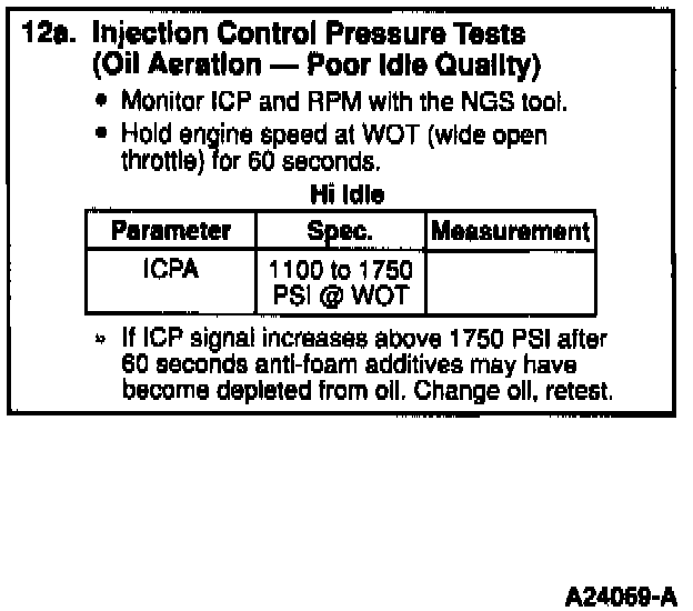Install New Generation Scan (NGS) Scan Tool. Access ICPA Parameter Identification (PID) on Scan Tool and monitor Injection Control Pressure (ICP). Operate the engine at wide open throttle for 60 seconds.