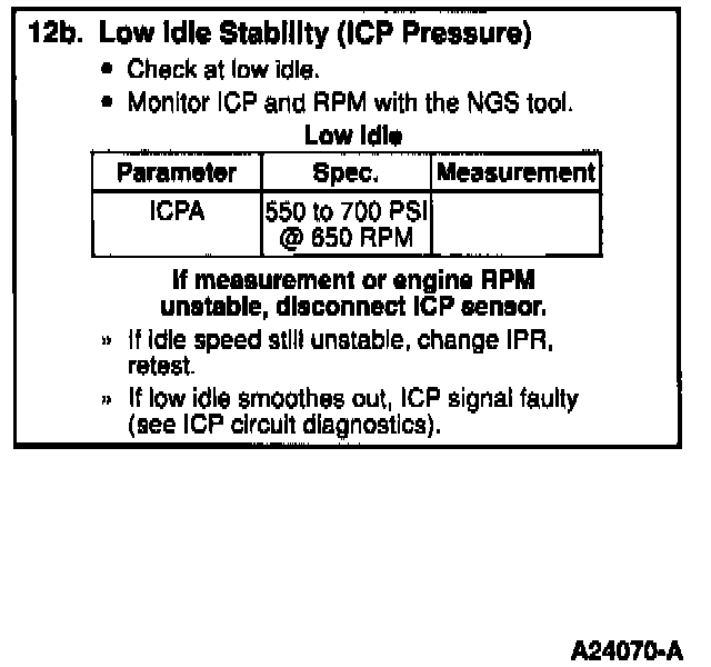 Install NGS scan tool. Access ICPA PID on scan tool and monitor ICP pressure. Operate the engine at low idle (650 rpm). If engine does not stabilize, disconnect the ICP sensor. If low idle speed stabilizes with the ICP sensor disconnected the problem is most likely in the ICP sensor circuit. X - Injection Pressure Regulator (IPR)