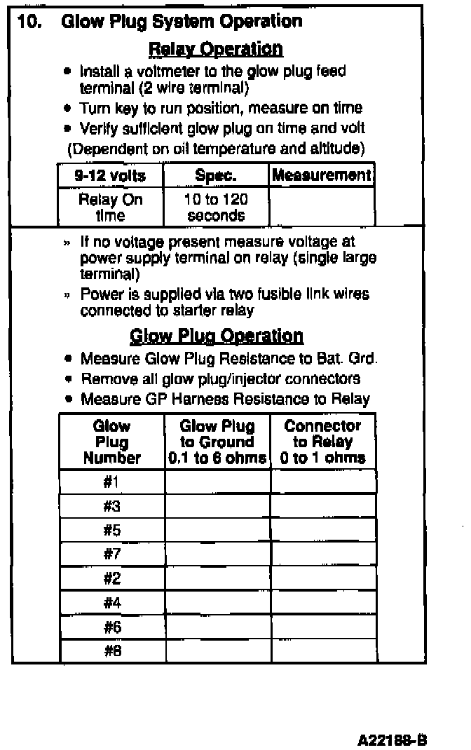 Install a Digital Volt-Ohmmeter (DVOM) on the glow plug feed side of the glow plug relay (large stud with two wires connected). Turn the ignition key to the ON position but do not attempt to start. Note the time in seconds from when the key is turned on and the glow plug relay energizes until the glow plug relay de-energizes. The glow plug relay makes a loud click noise which is easily heard when it energizes and de-energizes. The dome light will dim and the dash voltmeter will dip when the glow plugs are drawing current from the battery. Compare the times measured to the table (time will be affected by engine temperature, battery condition and vehicle altitude). The voltage at the glow plug feed terminal may vary from 9 to 12 volts depending upon battery condition.