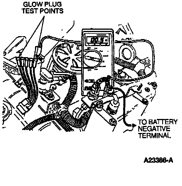 Disconnect all of the glow plug/injector harness connectors from the valve cover gaskets. With the pigtail installed, measure glow plug resistance to ground (preferably B-). A resistance measurement of 0.1 to 6 ohms indicates a good glow plug.