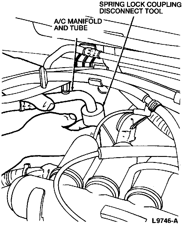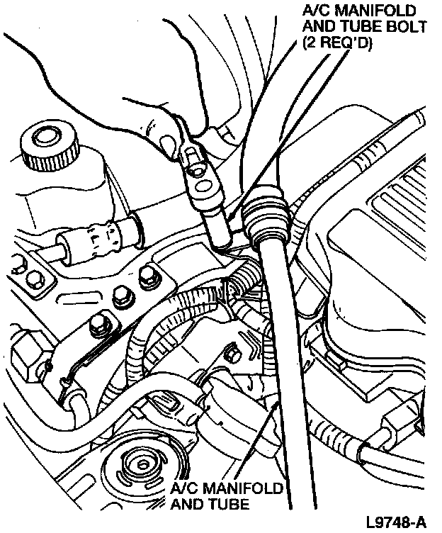 7. Lower the A/C manifold and tube out of the engine compartment.