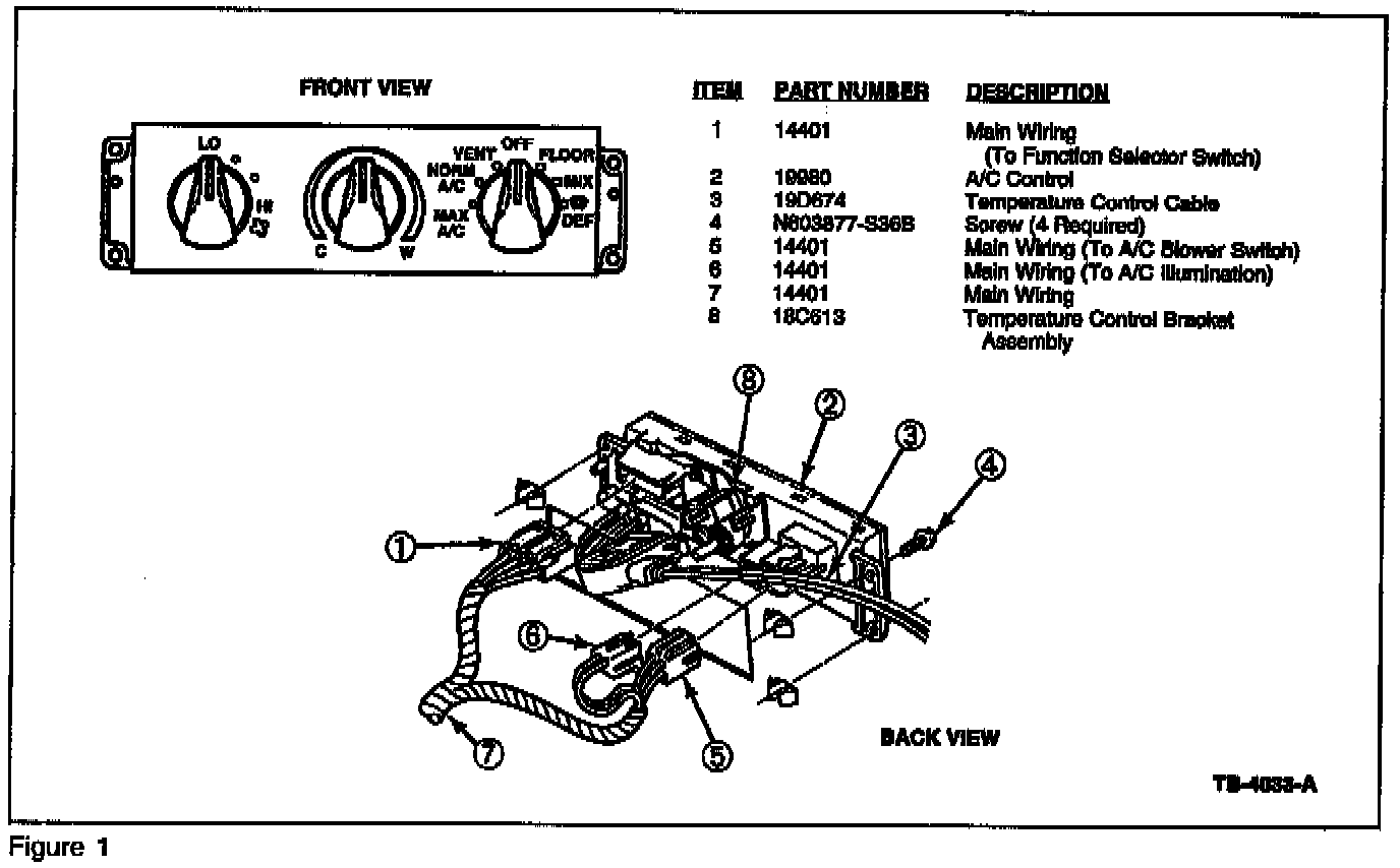 ^ Figure 1 - Control assembly for heater or A/C showing new temperature control cable bracket (F5ZZ-19D816-AA) in the assembly and the new cable (F5TZ-19988-B).