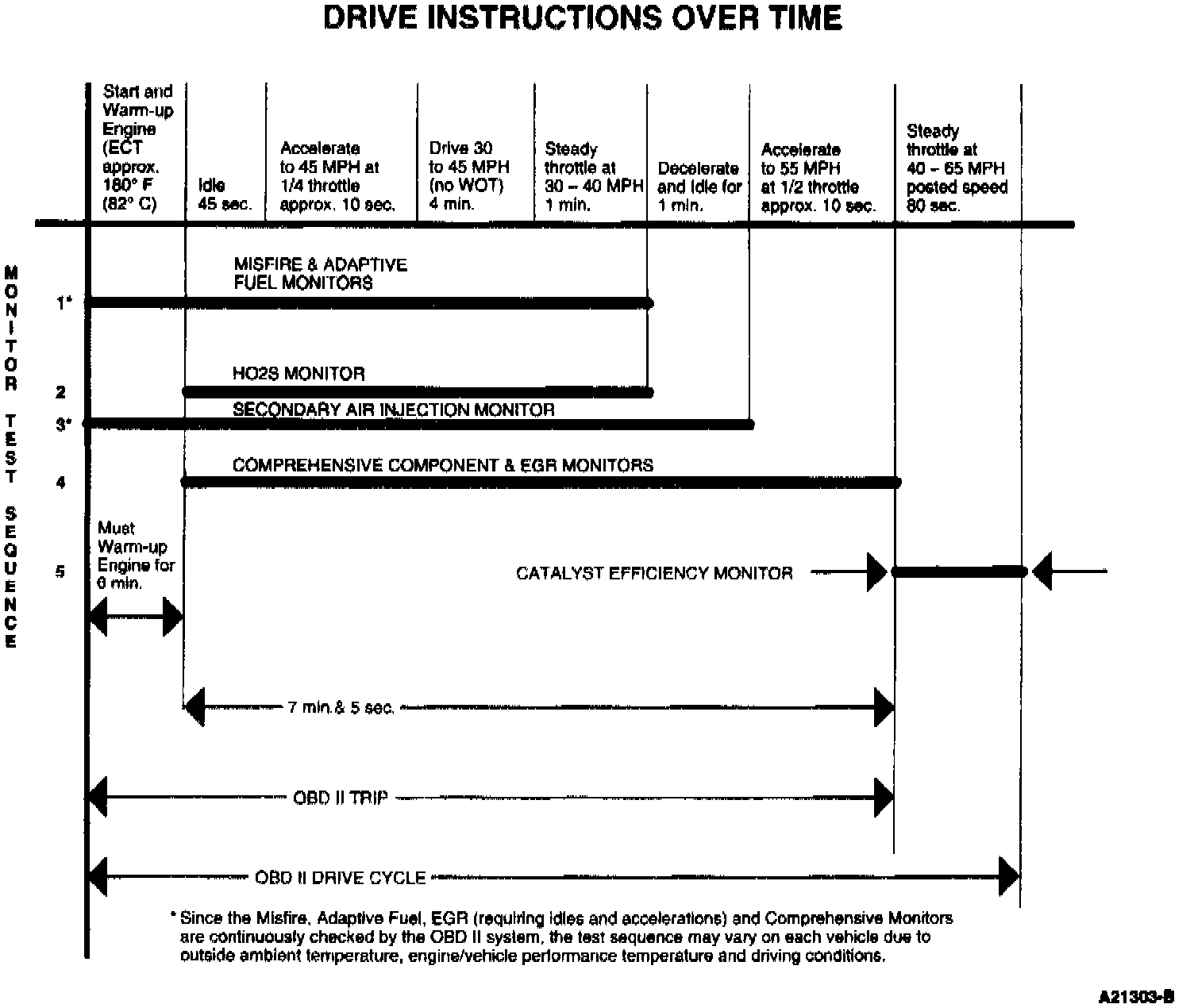 DESCRIPTIONThe Drive Cycle assists in identifying an OBD II system problem through total monitor testing (completing a Trip and the Catalyst Efficiency Steady State Monitor).